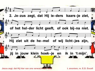 Jezus zegt dat Hij hier van ons verwacht. Jezus zegt dat Hij hier van ons verwachtdat wij zijn als kaarsjes brandend in de nachtEn Hij wenst dat ieder tot Zijn ere schijnjij in jouw klein hoekj. Jezus zegt dat hij hier van ons verwacht dat wij zijn als kaarsjes brandend in de nacht. De eerste strofe luidt.